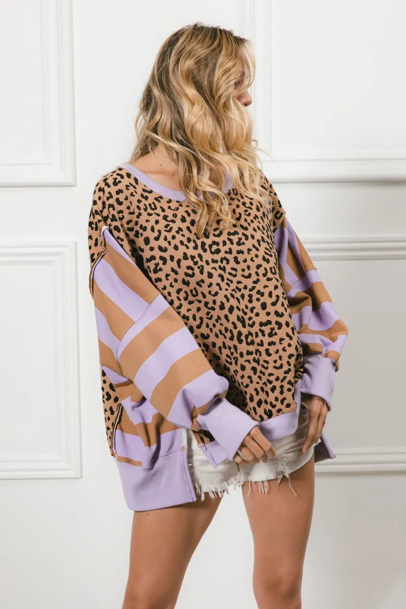 The leopard and stripe mixed top is a trendy and bold piece that combines different patterns for a unique and stylish look. The mix of leopard print and stripes creates a playful and eye-catching contrast. This top is perfect for making a fashion statement and adding a touch of edginess to your outfit. Stand out in style with the leopard and stripe mixed top as a fashionable addition to your wardrobe.
