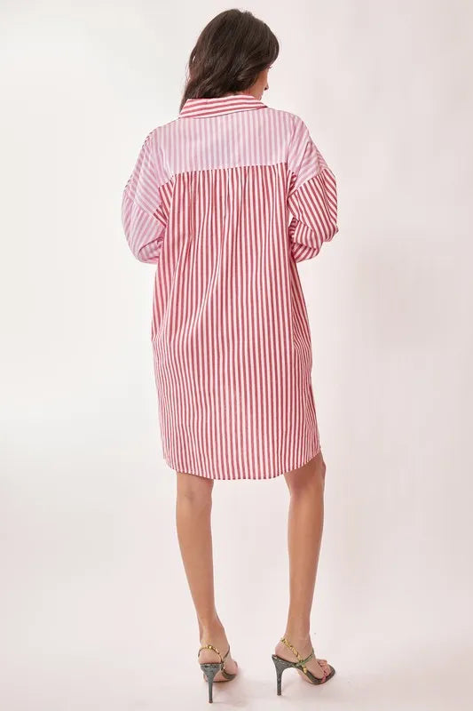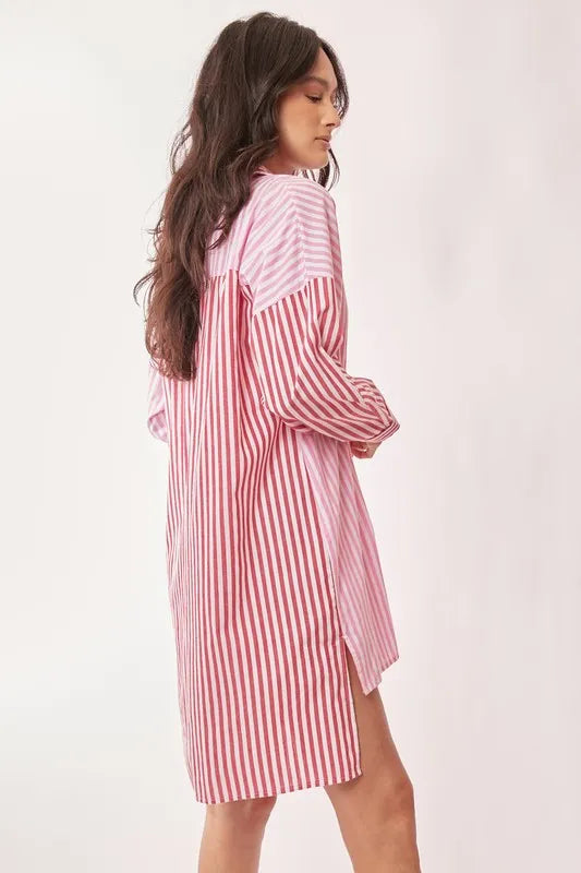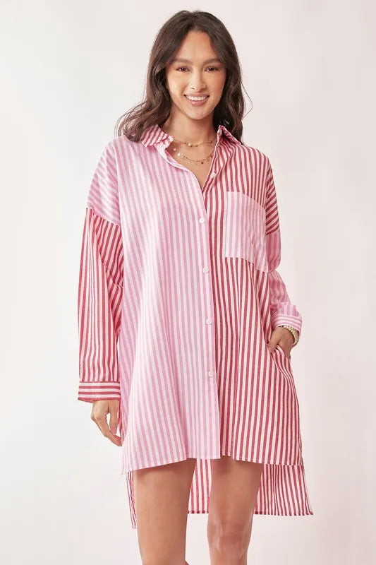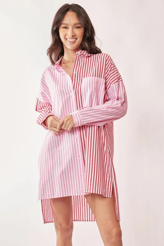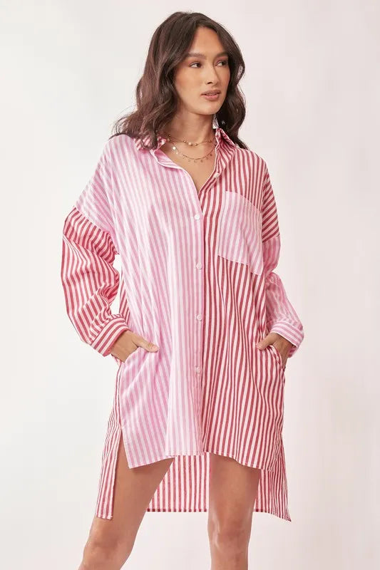 The multi-color stripe mixed button front tunic shirt dress is a versatile and chic garment that combines the style of a tunic and a dress. With a button front closure, this piece offers a customizable fit and styling options. The mix of stripes in various colors adds a playful and vibrant touch to the overall look, making it a fashionable choice for both casual and dressier occasions.