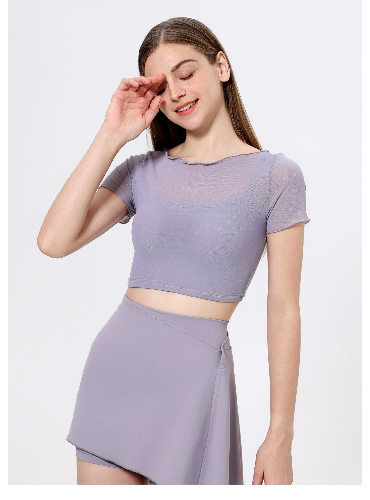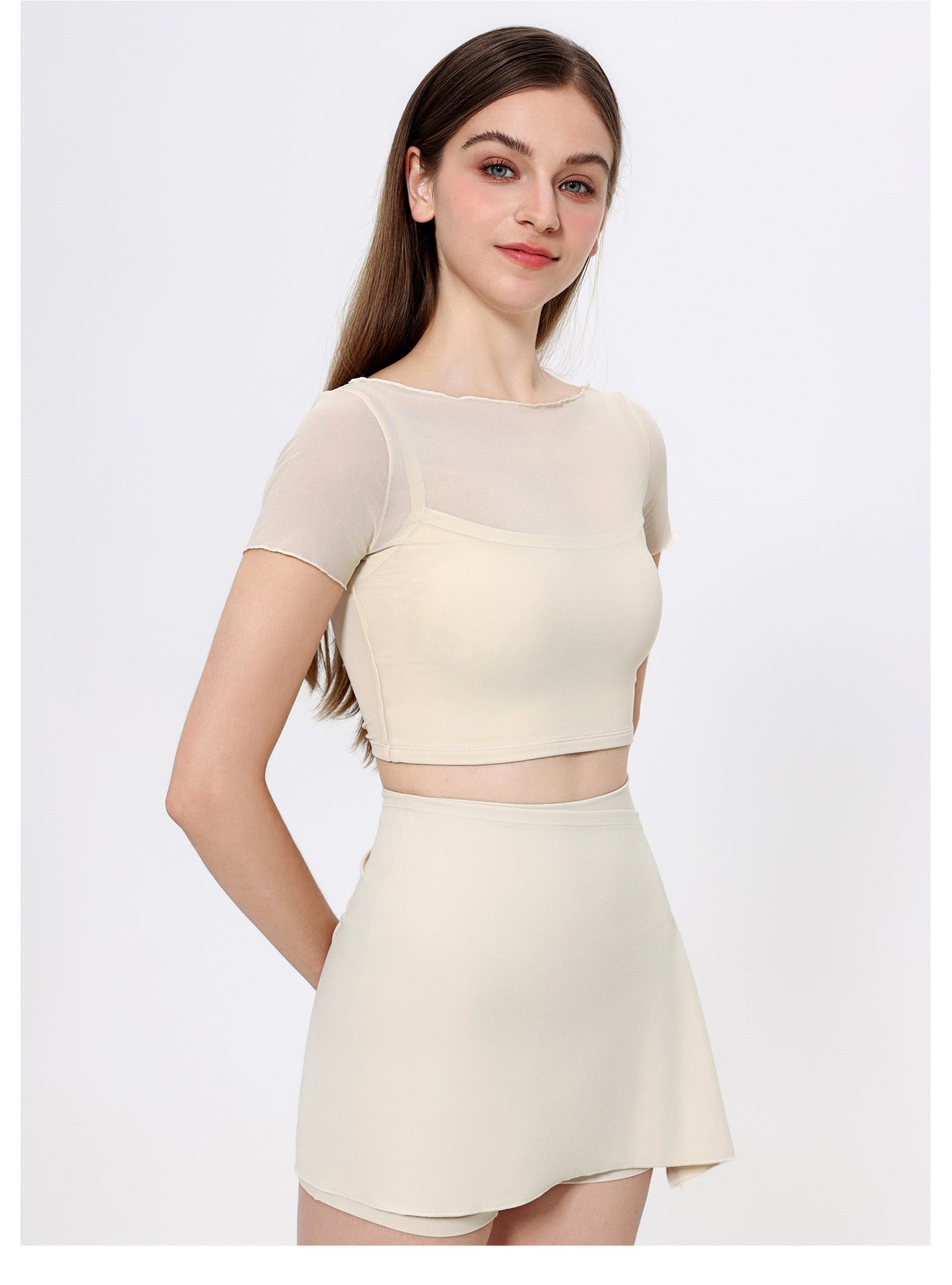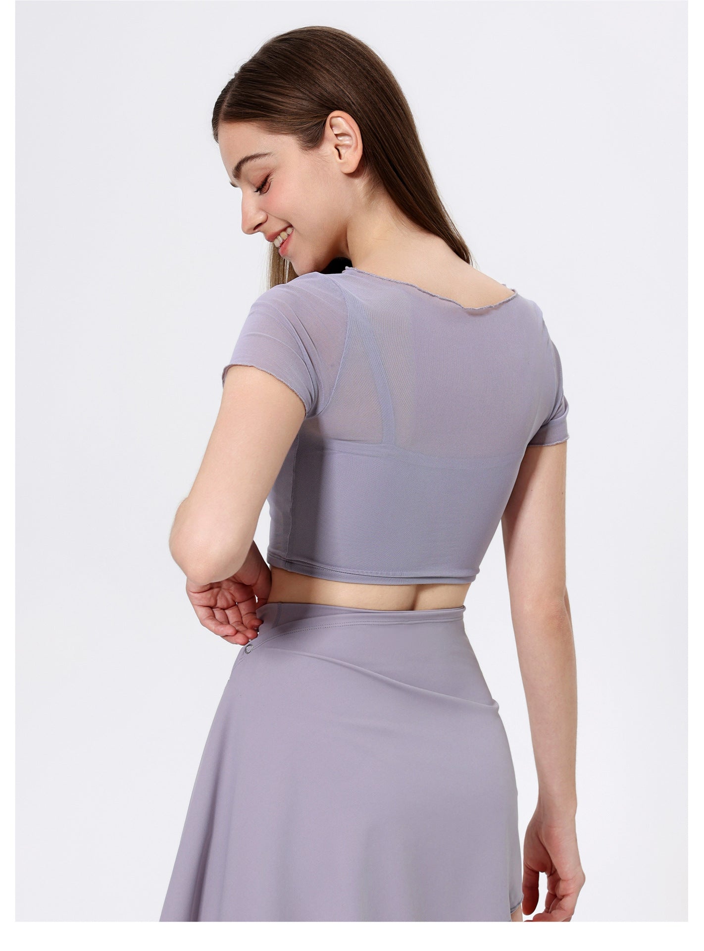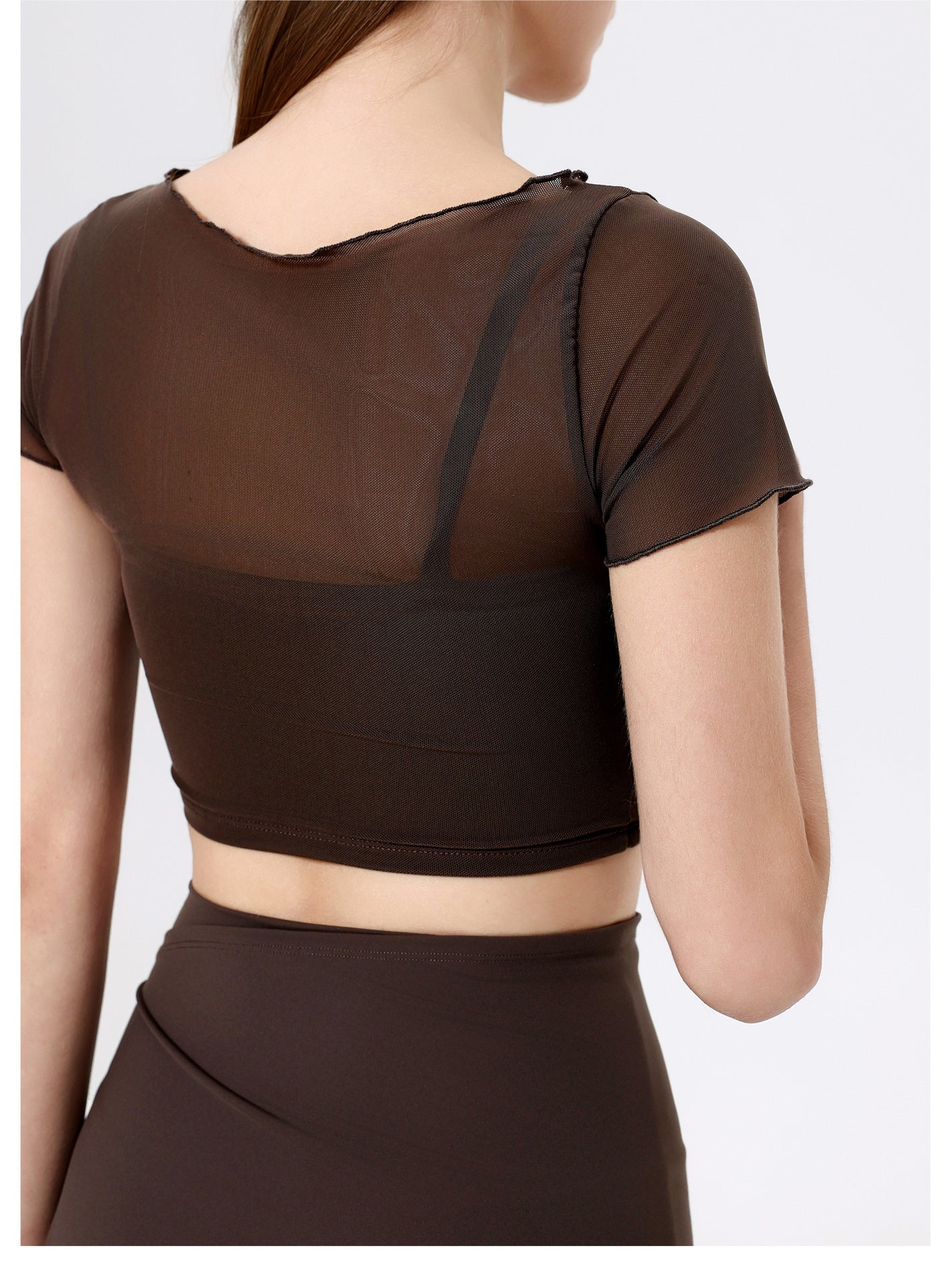 2pc Set - Womens Faux Mesh Sports T shirt Short Sleeve with Chest Pad Yoga Clothes Cropped Quick Drying Slimming Fitness Top