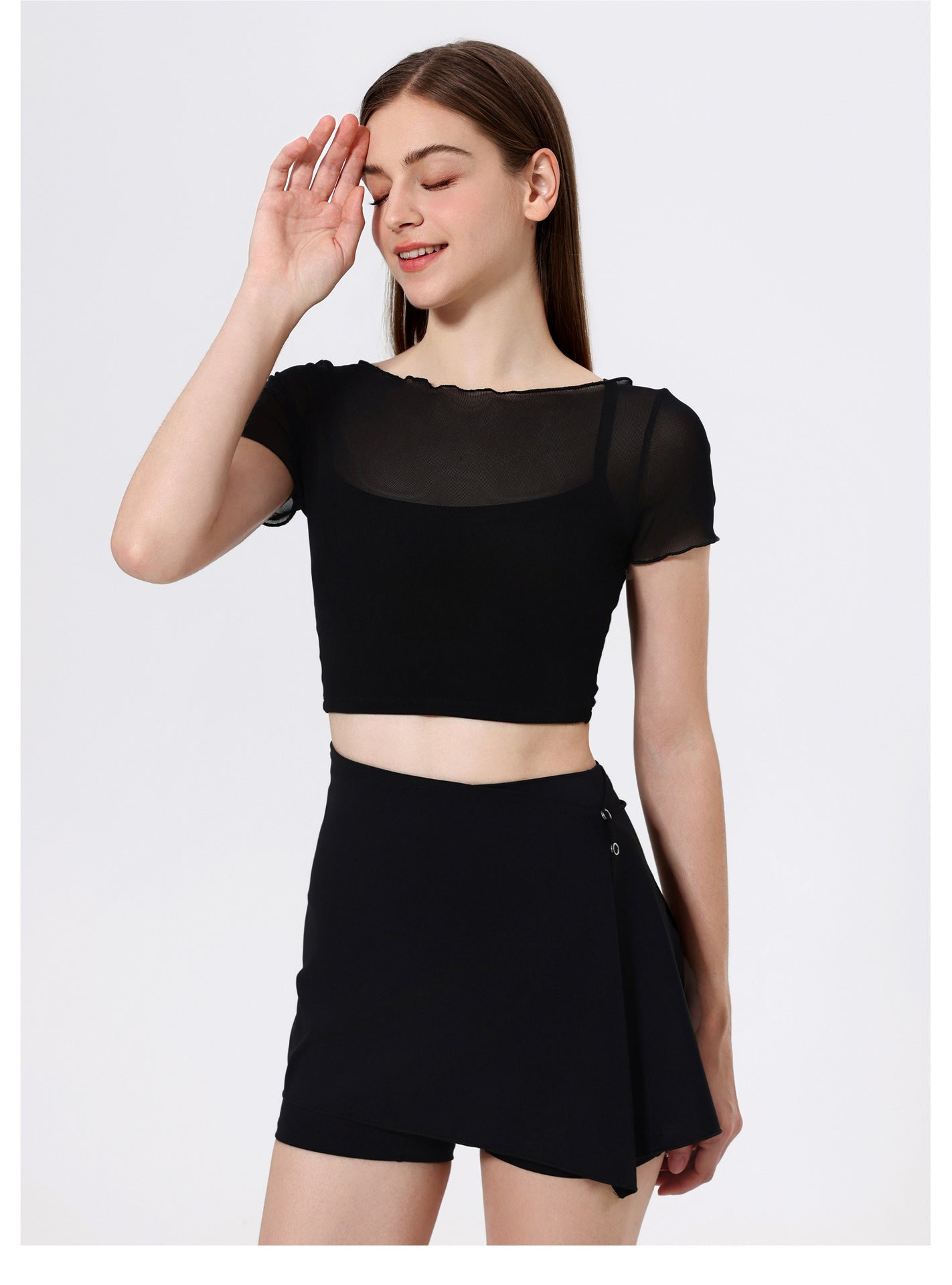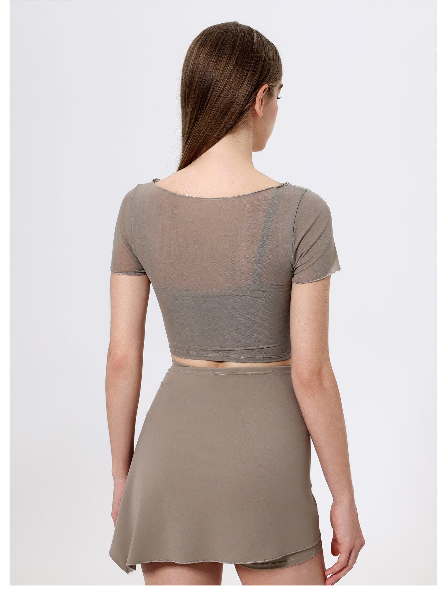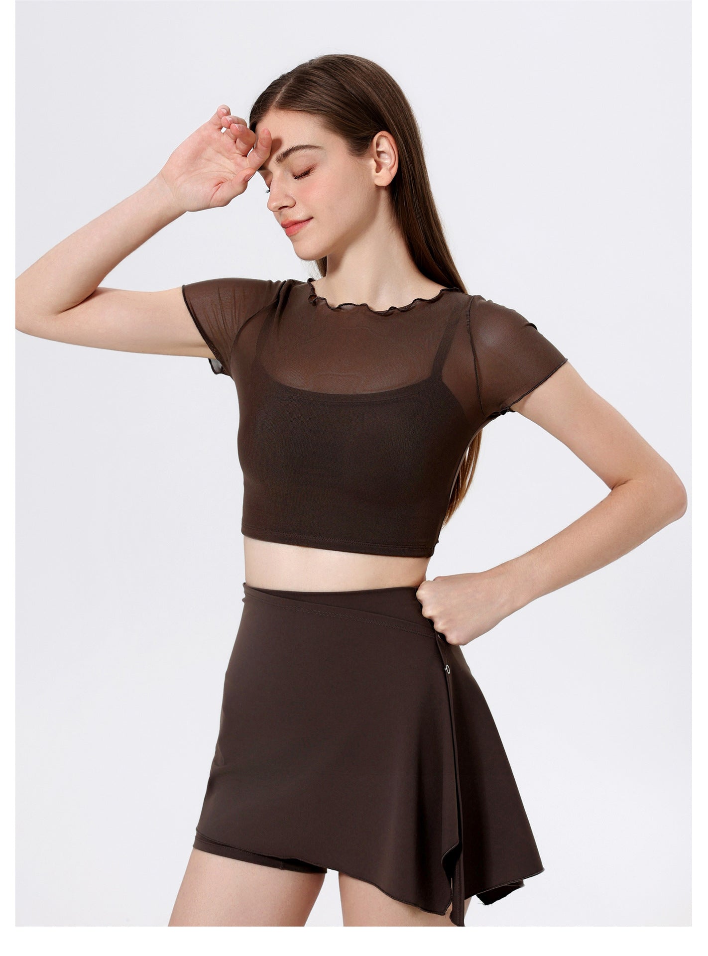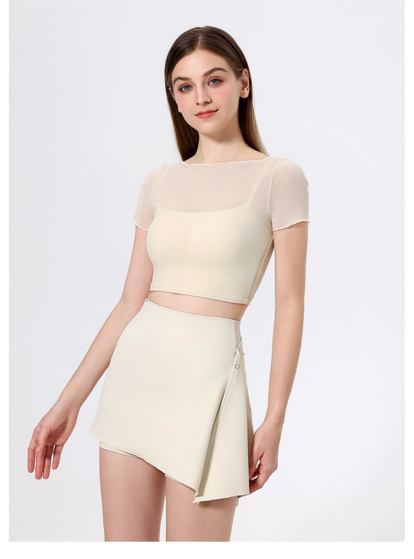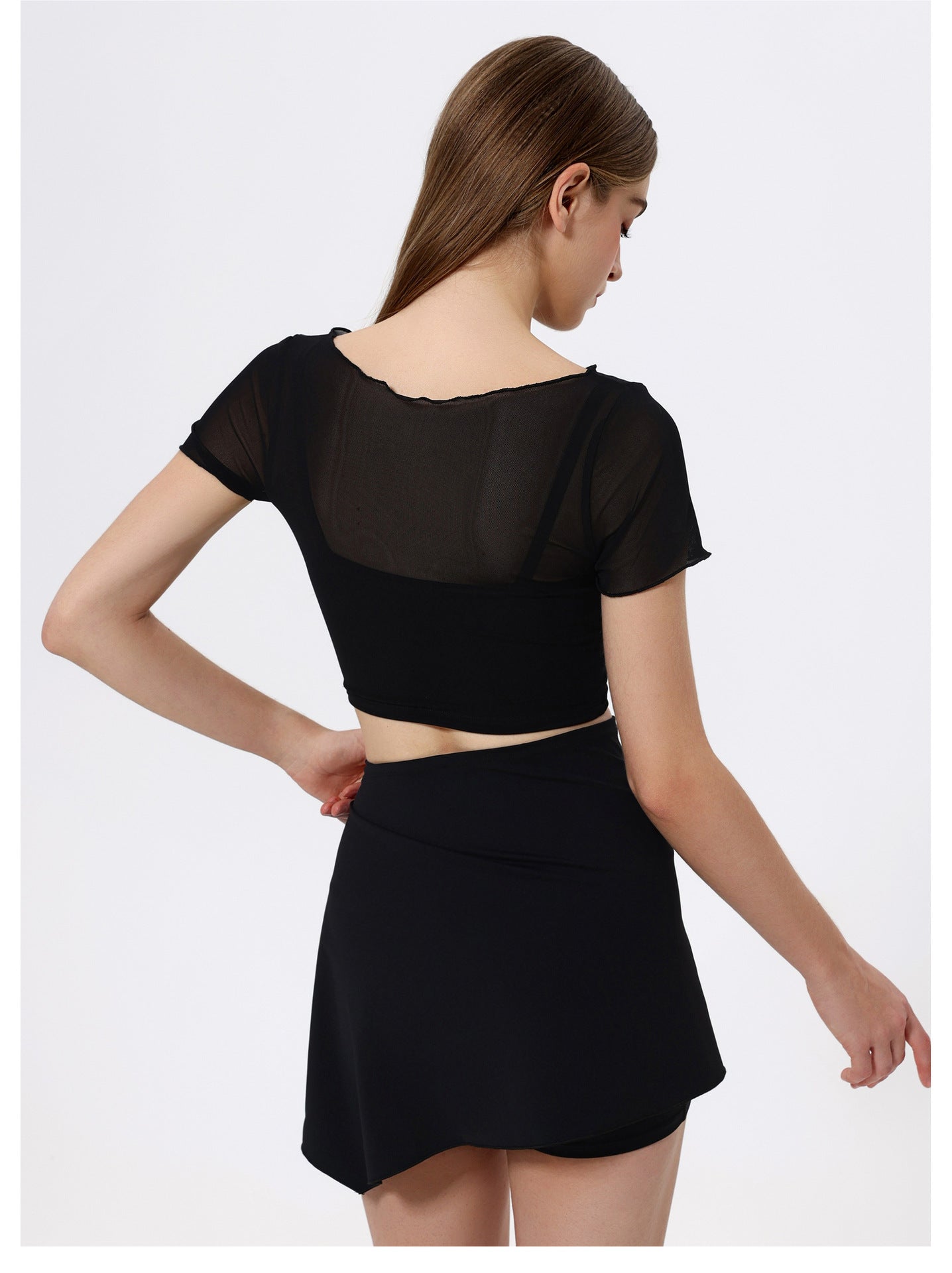 2pc Set - Womens Faux Mesh Sports T shirt Short Sleeve with Chest Pad Yoga Clothes Cropped Quick Drying Slimming Fitness Top