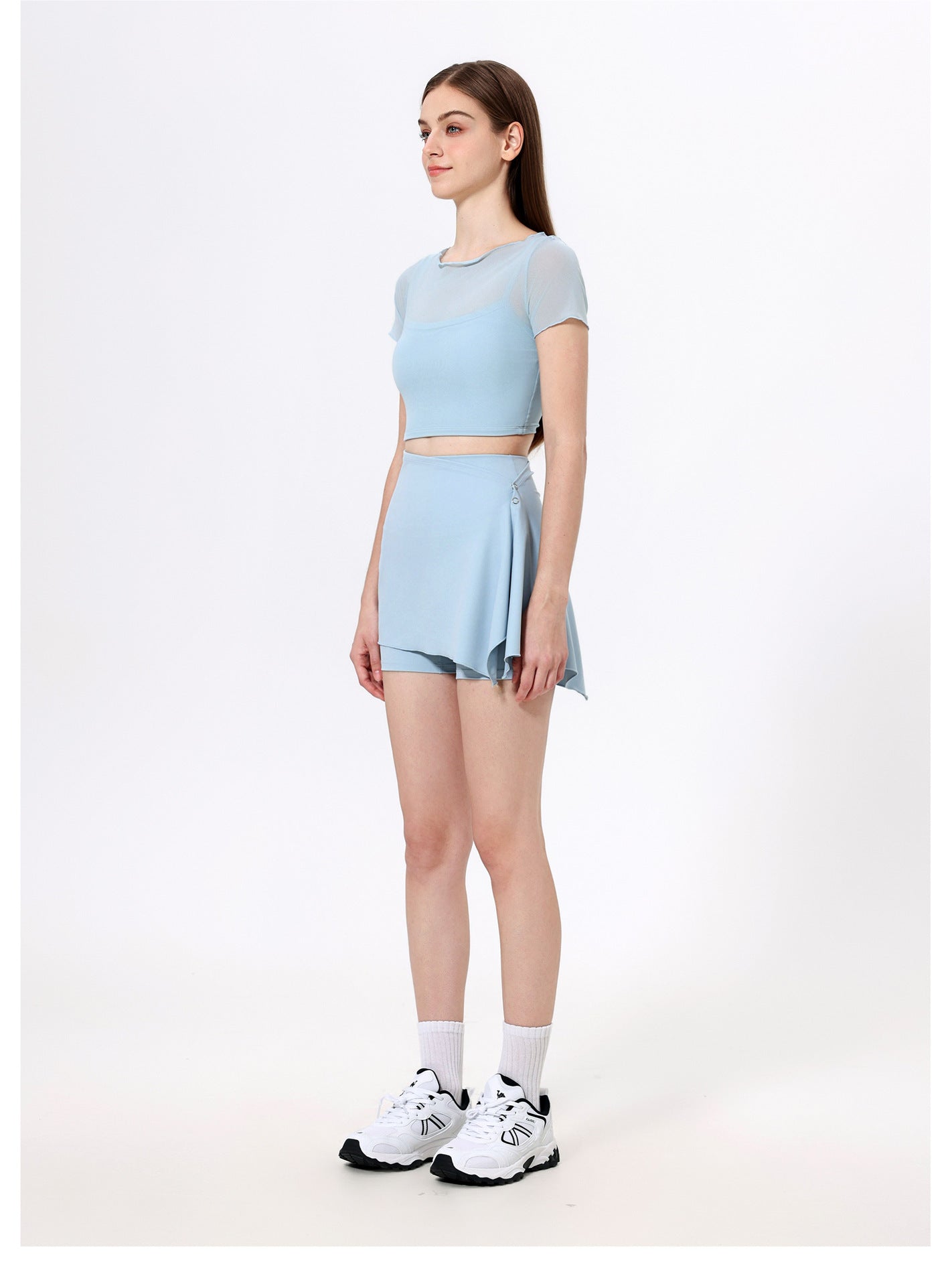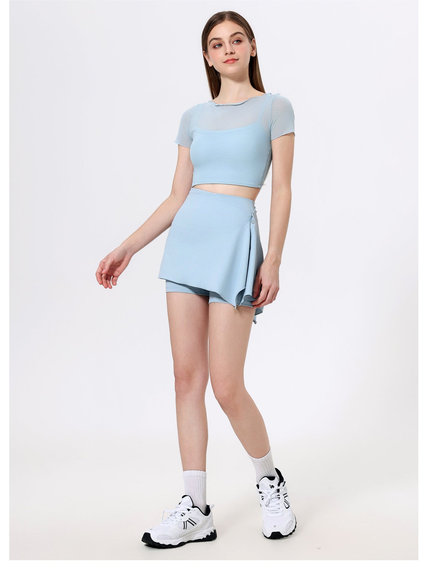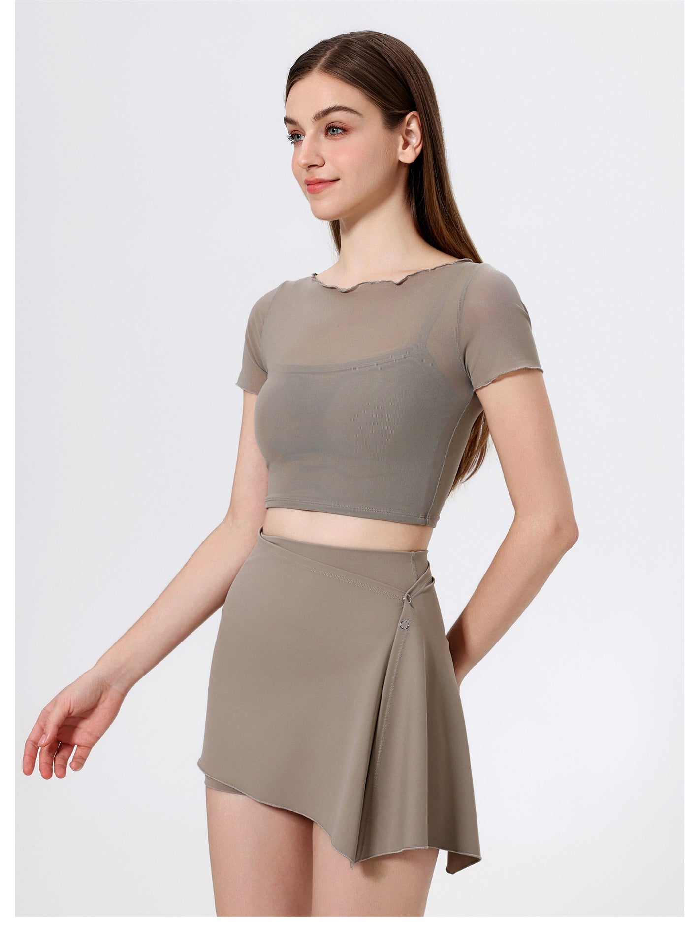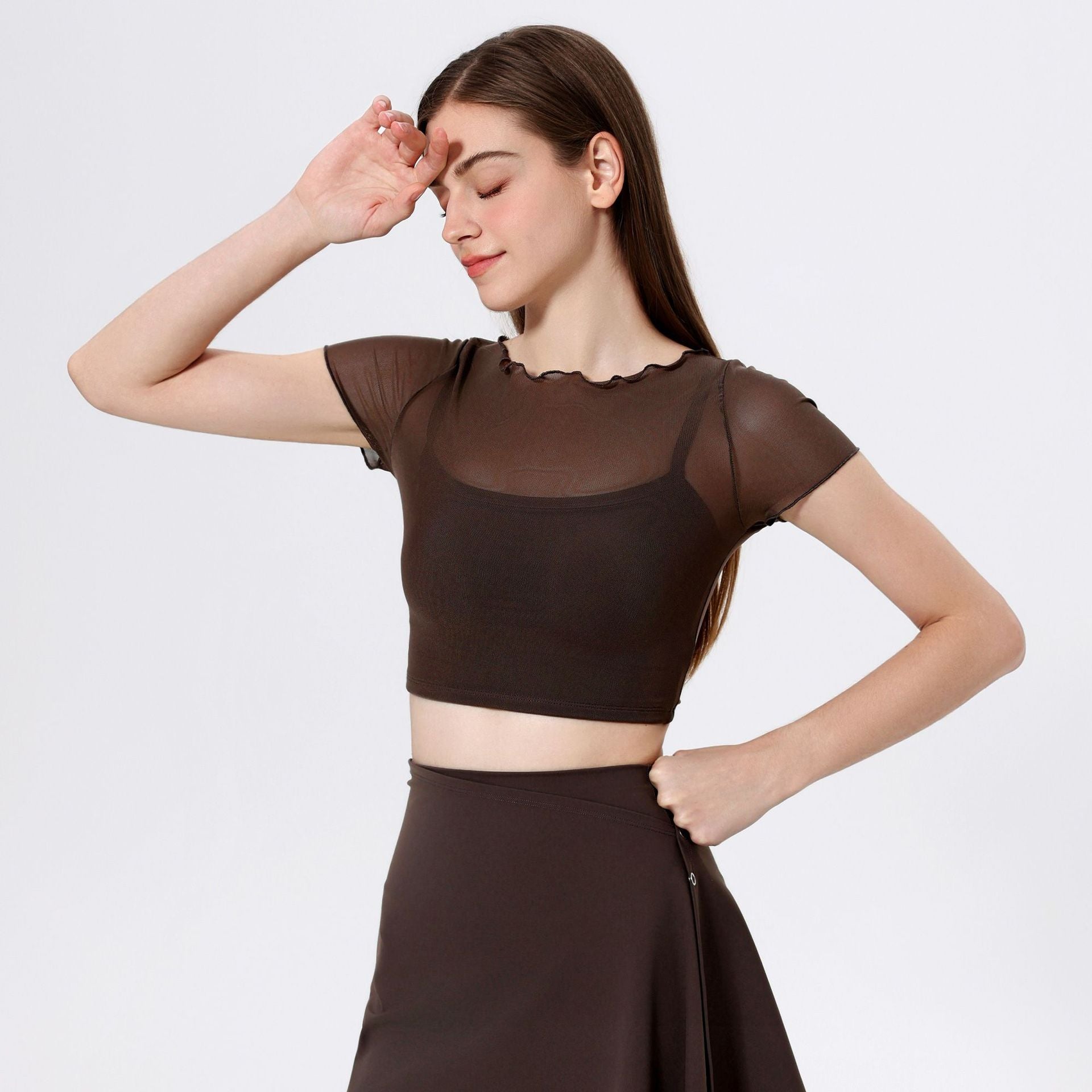 2pc Set - Womens Faux Mesh Sports T shirt Short Sleeve with Chest Pad Yoga Clothes Cropped Quick Drying Slimming Fitness Top