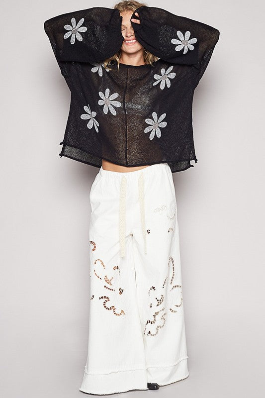 Flower Roll Edge Round Neck Drop Shoulder Knit Top is a charming and stylish piece that features a beautiful flower design scattered across the fabric rather than just at the edges. This unique placement of the floral pattern creates a cohesive and visually appealing look, adding a touch of elegance to the garment. The round neck and drop shoulder design provide a relaxed yet chic silhouette, making it a versatile top that can be dressed up or down for any occasion. Pair it with your favorite bottoms for a feminine and trendy outfit that showcases the beauty of the scattered flowers.