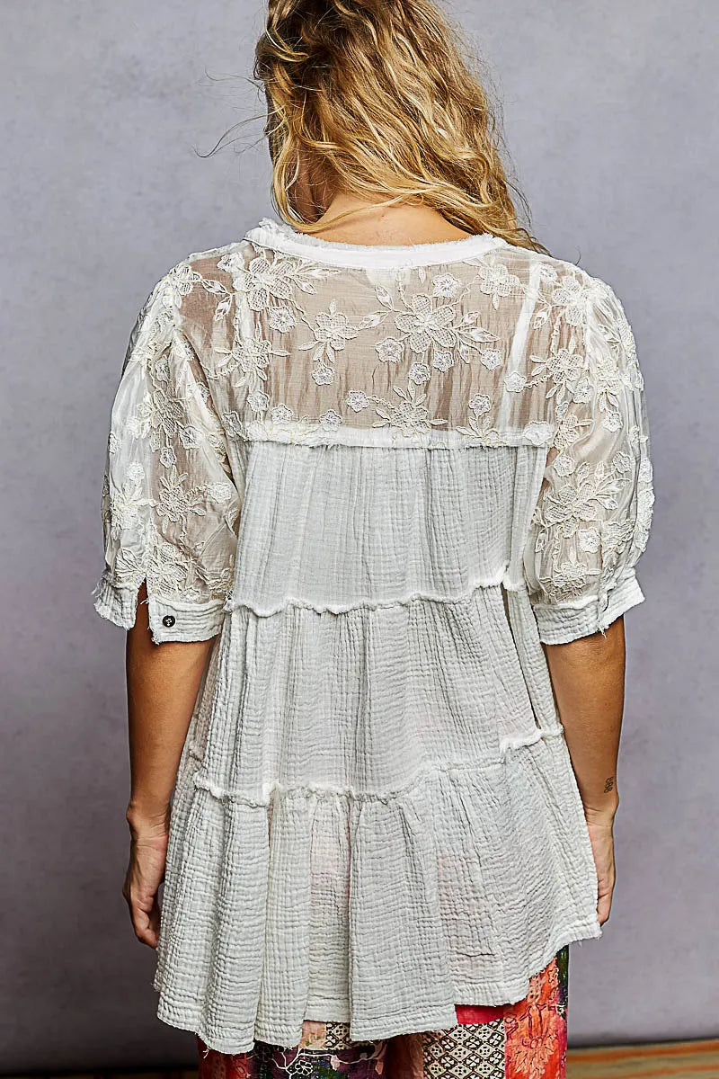 This enchanting bohemian-style blouse features exquisite lace trim along the neckline and sleeves, creating a romantic and feminine aesthetic. The tiered ruffle design adds movement and dimension, while the lightweight cotton-blend fabric ensures all-day comfort. The relaxed fit silhouette flatters all body types, making it perfect for casual outings or dressy occasions. The three-quarter sleeves provide elegant coverage, and the flowing design creates a graceful drape. This versatile piece can be paired with jeans for a casual look or dressed up with skirts for a more polished appearance. The intricate lace detailing showcases quality craftsmanship and attention to detail.