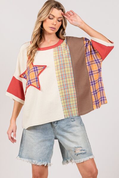 The Round Neck Plaid Star Patch T-Shirt is a trendy and versatile addition to your casual wardrobe. Featuring a classic round neck and a stylish plaid pattern, this t-shirt offers a cool and laid-back look. The star patches add a touch of fun and personality to the shirt, making it a standout piece. Perfect for everyday wear, you can easily pair it with jeans or shorts for a relaxed yet stylish outfit. The combination of plaid and star patches creates a unique and eye-catching design that will make you stand out. Elevate your casual style with the Round Neck Plaid Star Patch T-Shirt for a modern and fashionable addition to your collection.