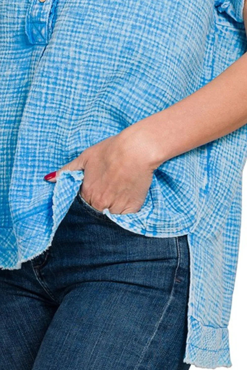 This stylish casual blouse features a beautiful blue plaid pattern crafted from lightweight, breathable fabric perfect for everyday wear. The relaxed fit design with short sleeves offers ultimate comfort while the classic button-up front adds timeless appeal. The flattering V-neckline and high-low hemline create a modern silhouette that pairs effortlessly with jeans, skirts, or shorts. Made from soft, easy-care material that maintains its shape and color after washing. Ideal for casual outings, work environments, or weekend activities. The versatile blue plaid pattern complements various wardrobe pieces making it a must-have staple for any fashion-conscious woman.